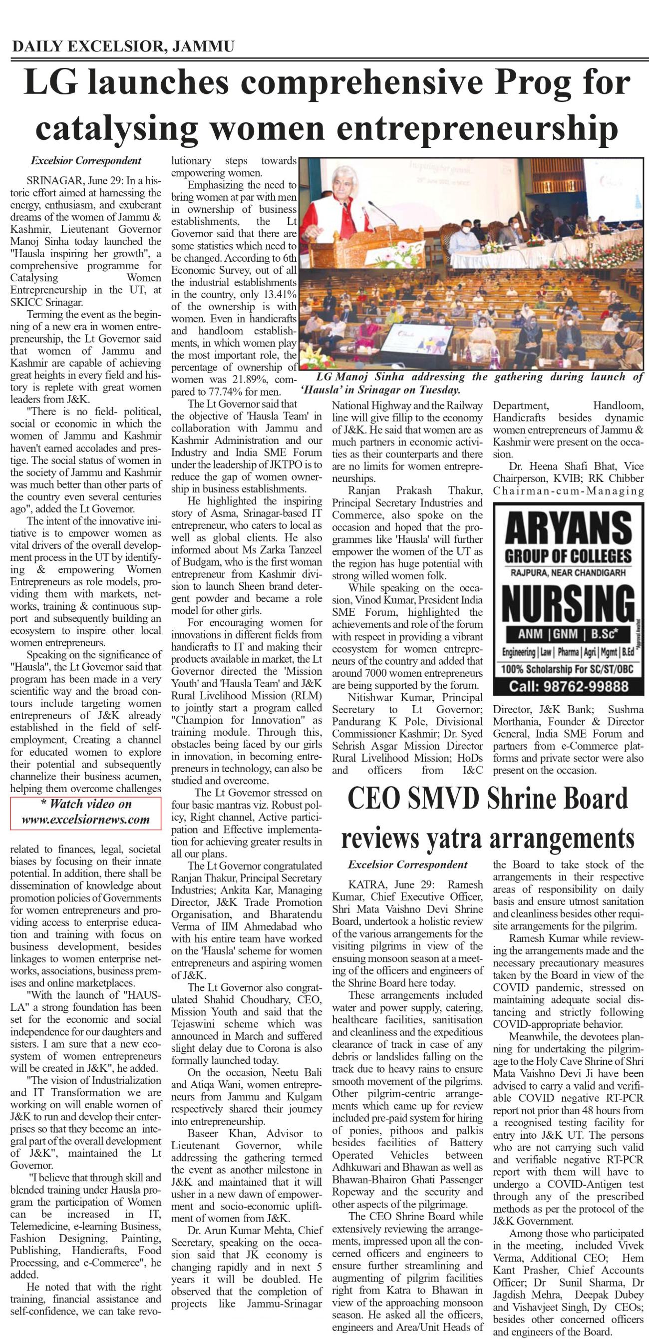 | 7 | 30-06-2021 | DAILY EXCELSIOR | LG Launches Comphrensive for Catalysing Women Entrepreneurship | view |